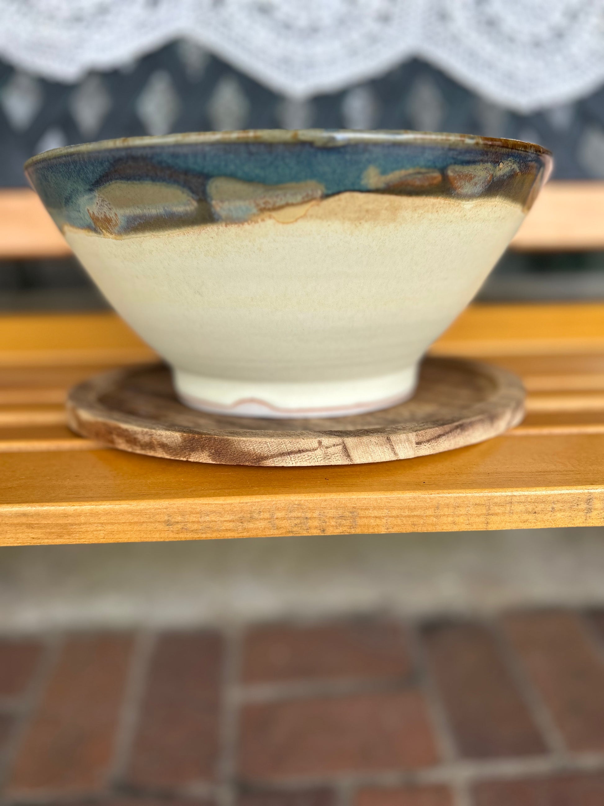 Elevate your dining experience with our Handmade Beige Bowl. Handcrafted from clay with a navy trim and a timeless beige base, this small to medium sized bowl adds a touch of elegance to any meal. Indulge in the unique, artisanal touch of this one-of-a-kind piece.
